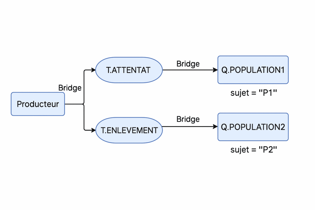 Le schéma ci-dessous représente le fonctionnement du bridge entre les topics T.ATTENTAT, T.ENLEVEMENT et les queues Q.POPULATION1 / Q.POPULATION2.