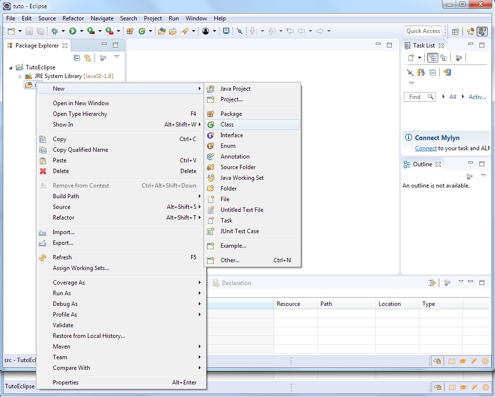 Pour continuer, faites un clic droit sur le projet/src, puis New ==> Class.